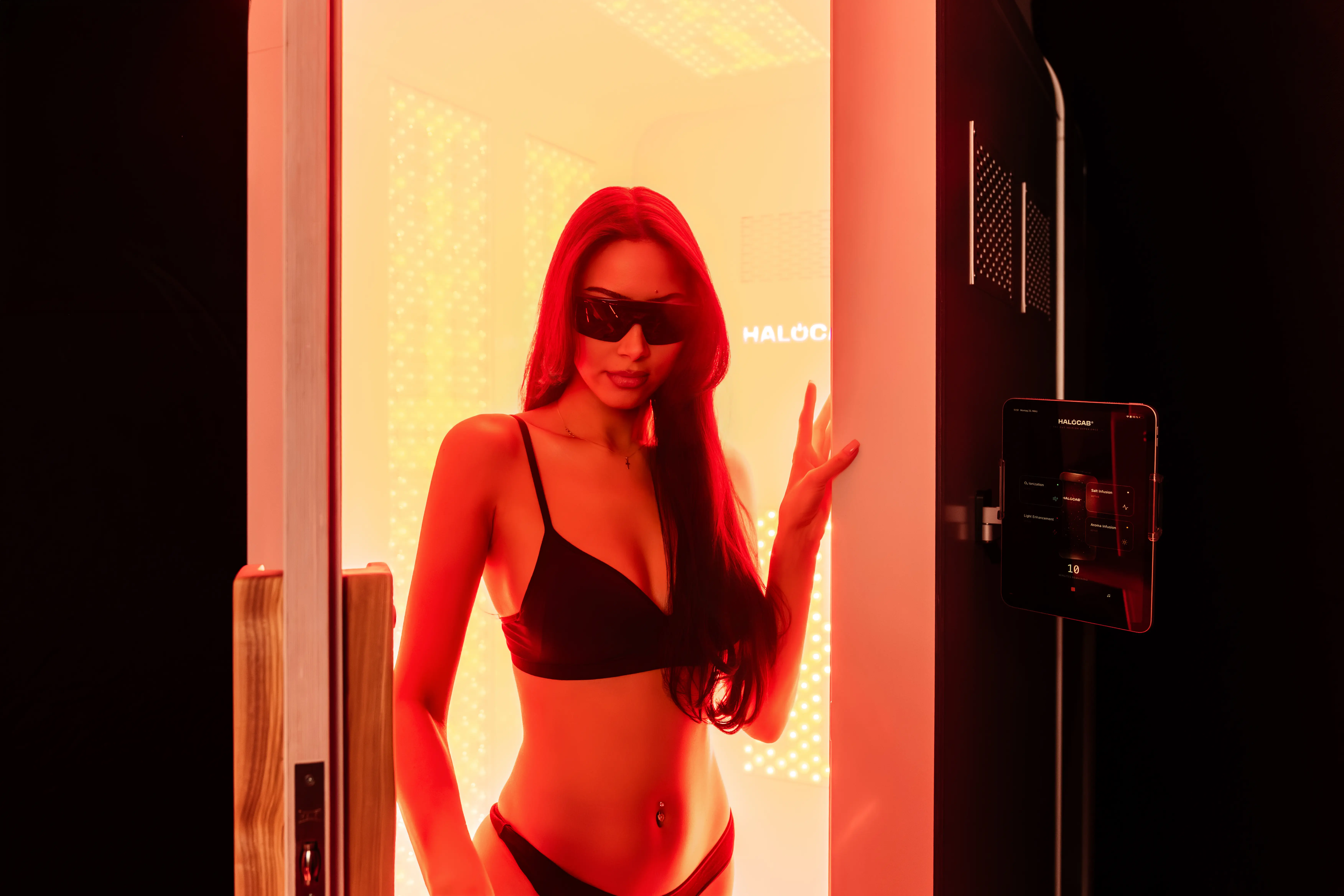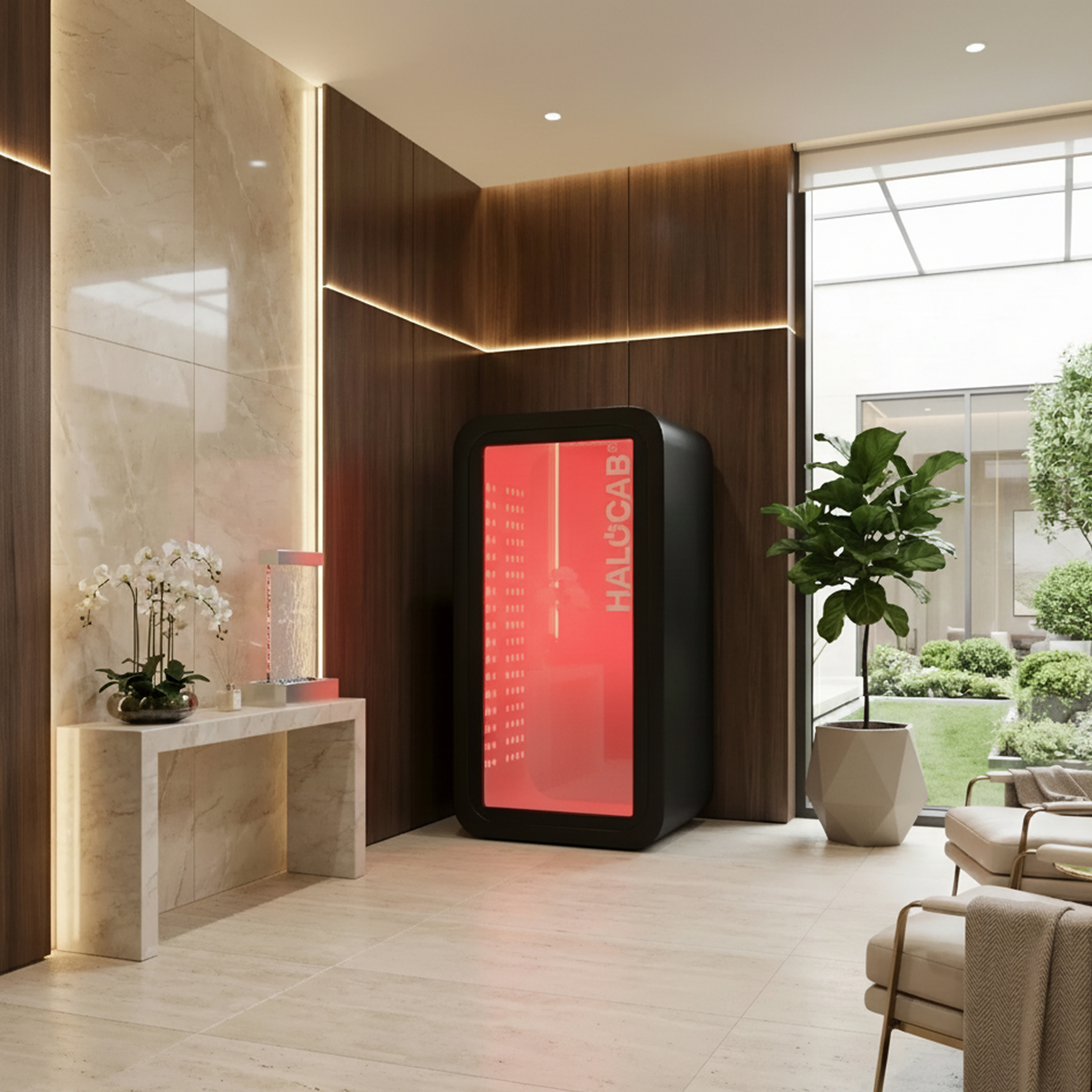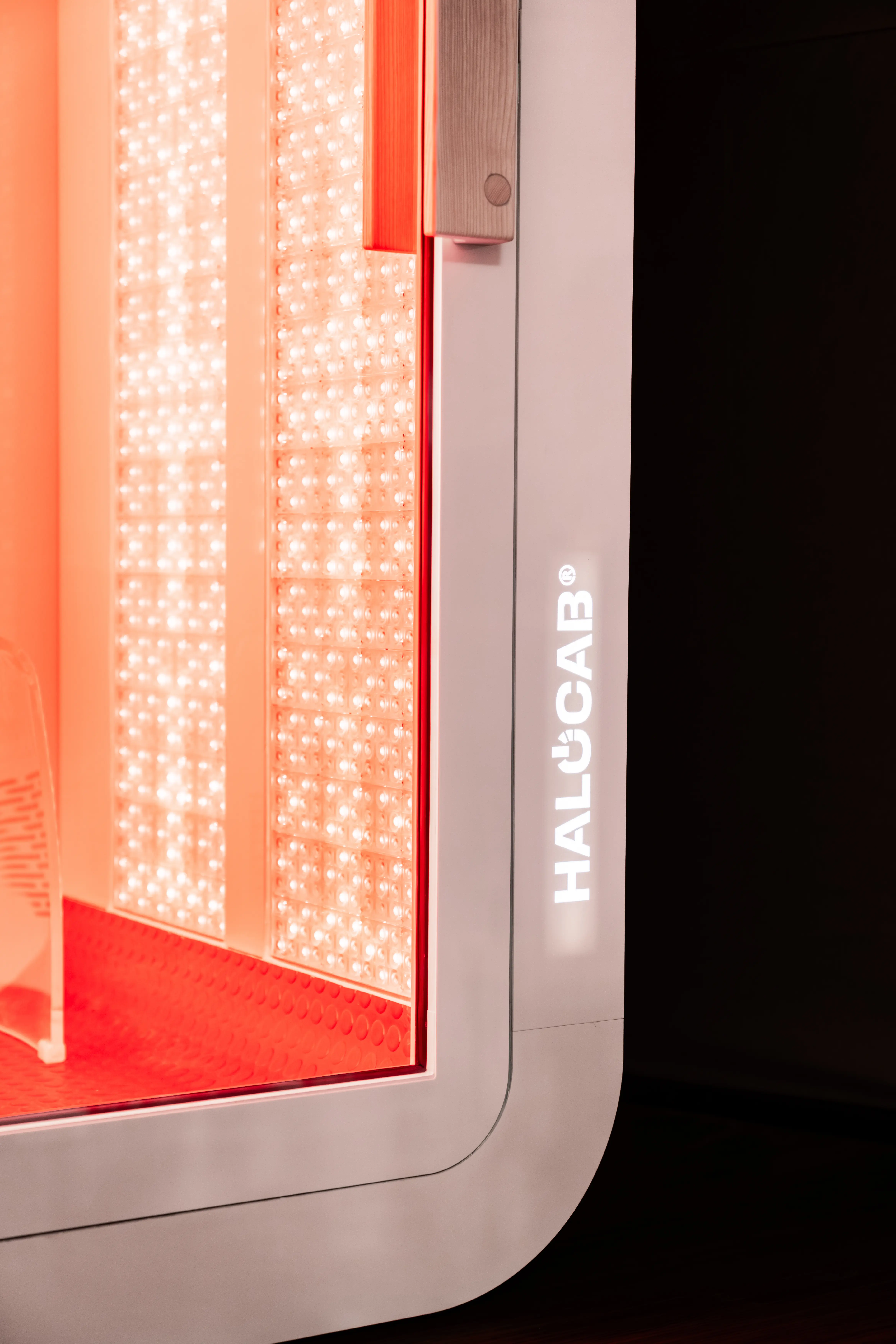 Halocab är ett helintegrerat välbefinnandesystem som kombinerar fem teknologier i en och samma kabin: saltinhalation, rött ljus, joniserat syre, ljudfrekvenser och arom. Systemet är utvecklat för att skapa en lugn, omslutande och återhämtande upplevelse för både kropp och sinne.